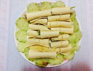 黄瓜丝,葱丝,肉丝,包好,用牙签固定