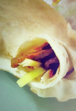 成品,拿一张豆皮,卷上一口肉丝,几根黄瓜条,大葱丝,再蘸上一点酱料,阿胡一口,太给力了哇!