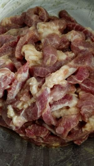 猪里脊或者精背肉都行,我喜欢带点肥,切肉丝,放胡椒粉,料酒,蛋清,淀粉,抓匀放置二十分钟