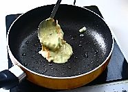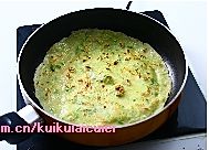 平底锅放油,舀入一勺摊成薄饼状,煎成金黄色翻面,两面都煎好后出锅。
