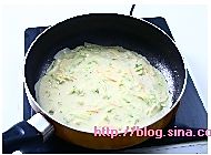 一个西葫芦擦丝;加入2个鸡蛋,少许面粉,盐,搅成稀糊状。