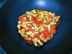 加入菜花继续翻炒.让菜花裹上茄汁.加适量盐和糖调味即可