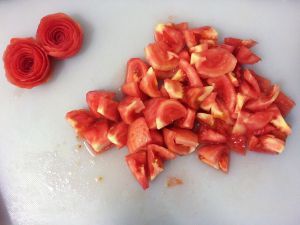 番茄切小丁。酱汁我放了一勺左右的醋,然后三倍生抽,盐糖各1/2小勺(小勺是放醋的勺子的1/2)好吧其实我没用勺子,大概就那个量的