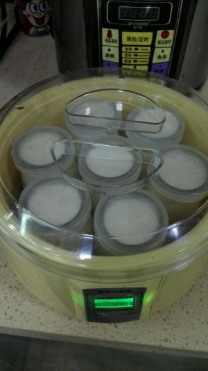 放入酸奶机,选择酸奶功能,一般8~10小时后就好了。