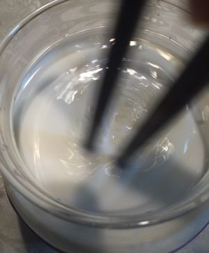 将温热的牛奶及酸奶混合倒入容器,用干净的勺子搅拌均匀。