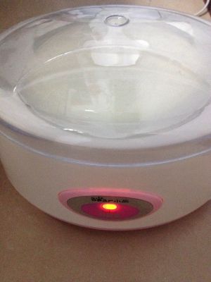 面包桶把搅拌片拿出来放入一些温水。 再把装好酸奶的容器放在上面,我是容器大了。就架在上面了。 选择酸奶功能,自动定时6小时。
