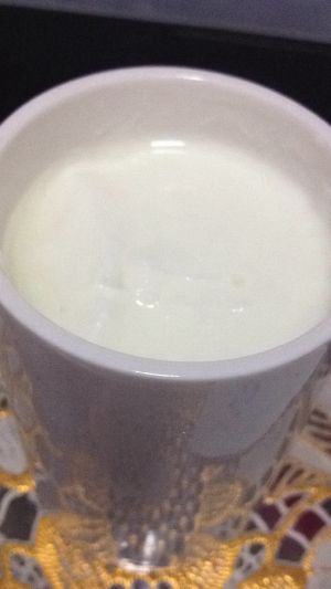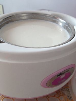 把材料准备好后,把酸奶机内胆用热水烫烫,这样可以杀菌,烫十分钟就行,把水倒掉,把菌和奶倒入,用勺子把菌粉拌开,插上电源就开始制作酸奶了