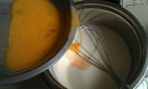 待奶液温度降低后,缓缓加入蛋液,一边加入一边搅拌