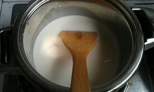 缓缓倒入牛奶液,边倒边搅拌,直到牛奶全部加入