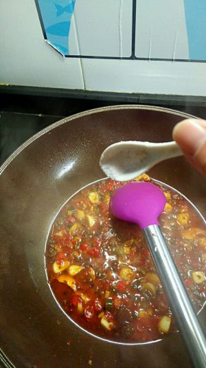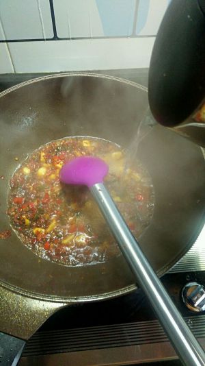 然后下泡椒、花椒粒、郫县豆瓣酱、大蒜、老姜炒香,再下入洋葱块、香料粉炒香
