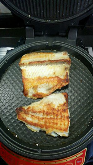 半条去头的鱼用盐,胡椒粉,料酒腌制一小时以上。因为一个人吃所以只用了半条鱼,如果是整条请合理增加调料。 用电饼铛烤鱼档把鱼烤至二面金黄。放在盘子里。