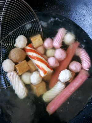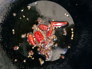 放入一锅地油,倒入花椒八角红辣椒爆香,将配料捞出。