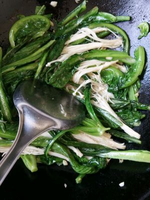 锅内放入少许油,蒜末爆香,倒入生菜金针菇木耳翻炒两分钟,再加入油麦菜翻炒一分钟,出锅备用。
