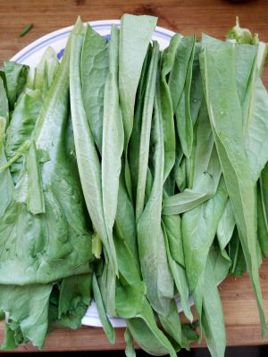 将油麦菜用开水焯一下,打蔫后立即出锅。再将土豆片藕片胡萝卜片焯水,水开后沥出。最后放入海带,也是水开后沥出