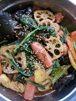 倒入一袋麻辣香锅底料翻炒几下,加入肉类翻炒,再放入焯过水的土豆藕片胡萝卜海带片继续翻炒,快熟的时候放入炒过的青菜,快速翻炒一分钟即可出锅。如果觉得汤少的话可倒入适量开水。