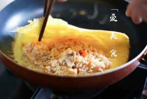 米饭盛出备用。另起锅加入黄油,鸡蛋液入锅,快速转锅成圆型。