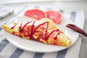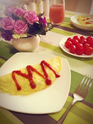 蛋饼盖在米饭上,倒入番茄酱就可以吃啦~~~~