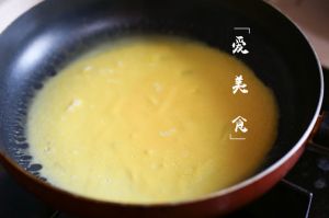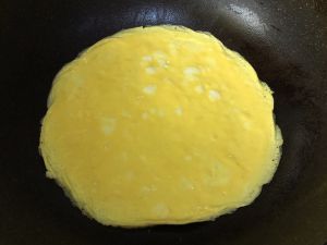 中火,锅内用小刷子刷少量油,倒入蛋液,晃圆,摊成蛋饼。