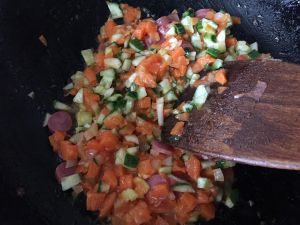 中火,锅内适量油,先炒洋葱和胡萝卜,洋葱炒香,胡萝卜炒软,再放入西红柿,黄瓜和腊肠,翻炒三分钟。