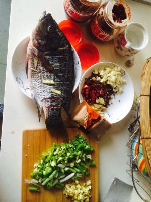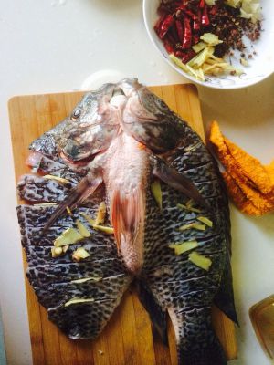 调腌汁:生抽2茶匙,黄酒2茶匙,精盐1小勺,白胡椒粉1小勺,孜然粉1小勺,姜丝1撮,白糖1小勺,辣椒粉1小勺,香油若干滴,调好汁后抹在鱼身上,反复抹擦,腌制一小时。