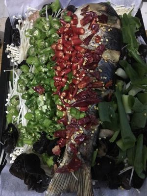 集烧烤、水煮、响油三种烹饪方法的葱油烤鱼,劲爆上桌了。麻辣鲜香,色泽红亮,鱼肉入味,汤汁鲜美。将烤盘架在桌上,烤盘底下用固体酒精炉燃烧,更使沸腾的汤汁渗入到鱼肉,香气四溢,诱惑难当。