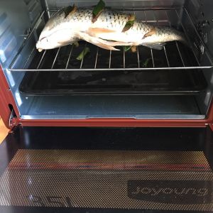 鱼从上背开边杀好洗净,用盐,料酒,椒盐,小茴腌制二十分钟后,按图的样子放入预热后的烤箱中层,用220度上下层烤25分钟。