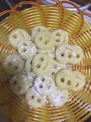 用筷子戳出两眼睛 汤匙末端刻出微笑的嘴 撒一些面粉 避免相互粘粘