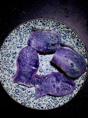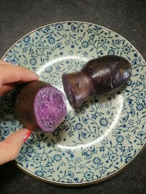 紫土豆切开,皮上画十字,便于后面剥皮