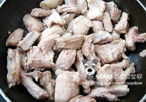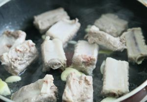 锅烧热,加少许油润下锅,下蒜和肋排翻炒至变色。