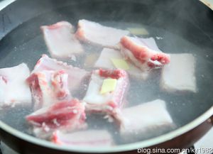 肋排跺成小段洗净和生姜一起放入适量冷水的锅中,大火烧开将肋排焯水后捞出沥水。