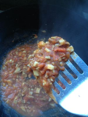 把适量黄油放入锅中化掉,在油不是很热的时候放入猪肉馅,用筷子搅拌,把肉馅打散,肉馅快熟的时候加入番茄丁,番茄汁和番茄酱,适量的盐和黑胡椒粉。翻炒至有粘稠感时加入洋葱丁,翻炒几下关火。