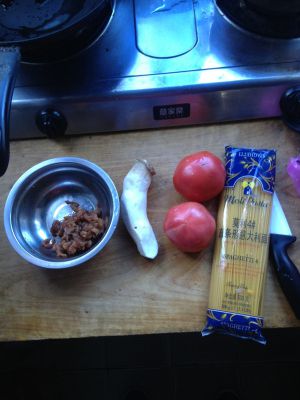 首先,把意面放水里泡2-3分钟,然后下锅煮,记得在水里加盐,会熟的快些,大约7分钟左右,记得时不时搅拌。熟后过凉水备用。