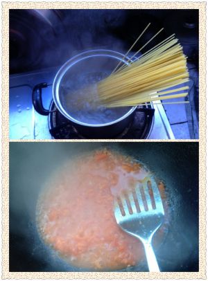 熬番茄酱的同时下意面。煮意面加些盐,防止粘连,意面煮十分钟左右。酱汁熬到番茄都看不见为好