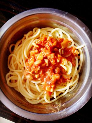 将意面加入沸水中煮熟(多煮一会儿),倒入冷水中备用。锅烧热倒入适量橄榄油,放入洋葱、肉糜炒熟,再倒入胡萝卜、杏鲍菇,炒熟!加入意面酱,炒几下加入煮好的意面进行翻炒,加入适量的盐和水,翻炒均匀后焖一下,入味!