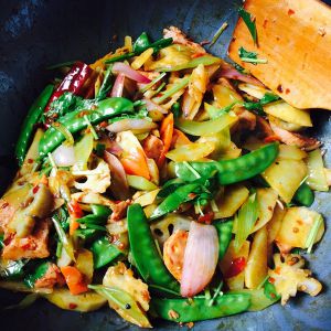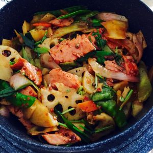 起油爆香干辣椒、洋葱和青蒜,加香锅底料翻炒,放入午餐肉和调汁(生抽+老醋+花椒油+蚝油+五香粉)翻炒,陆续放入过油的土豆、胡萝卜,过水的莴笋、莲藕、荷兰豆,翻炒均匀关火加香菜完成。注:干辣椒和花椒油可以不放。视个人情况而定。