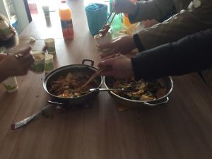 锅烧热,放香辣酱炒香,放胡萝卜土豆先炒,再放其他食材,炒啊炒。