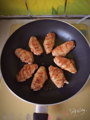 鸡翅提前腌制过的,锅里放油煎制金黄盛出备用。