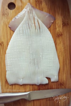 鱿鱼用刀横竖滑口,这样为了好看!鱿鱼片要切大一点,因为一煮就缩小了!