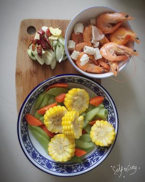 虾、鱿鱼、蔬菜都过水煮至半熟捞出;葱姜蒜切好备用!
