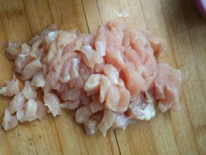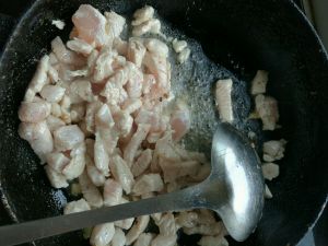 将鸡脯肉提前用料酒腌制5分钟,然后和生姜末一起入油锅炒熟备用。