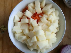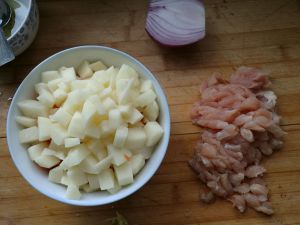 准备所有材料,鸡脯肉先用生抽和料酒腌制入味,胡萝卜和土豆去皮备用