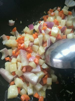 重新放油,把土豆丁,胡萝卜丁,洋葱丁炒香,什么调料都不用放。然后加水没过蔬菜,煮至蔬菜软熟。然后关小火,加入咖喱块慢慢翻煮至咖喱块完全化开,边煮边搅以免粘锅,至汤汁粘稠即可出锅。如果煮菜时水加多了,可多加咖喱块,水少了可随时添加开水进去。