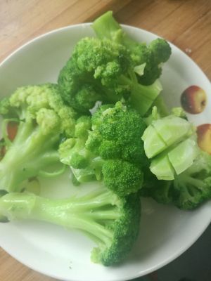 将洗干净的西兰花摘成小朵,开水锅内加少许食用油或橄榄油,少许盐,焯熟。放油和盐的目的是为了西兰花看起来颜色脆亮,味道好吃。