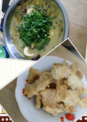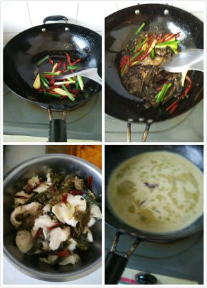 下酸菜翻炒几分钟后,加适量水,把之前炸过的鱼骨放下去,汤沸腾之后,把酸菜和鱼骨捞出来垫在盘底,然后把腌制的鱼肉倒入汤中(可以放一点嫩豆腐下去,切大块,嫩豆腐加酸辣的汤汁,超级美味),熟了之后把汤和鱼肉倒在酸菜上!