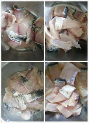 鱼可以直接买身体部分,然后让店主切片,这样可以省很多时间,回家清洗一下,加料酒少许,淀粉,鸡蛋,抓匀腌制10分享左右。