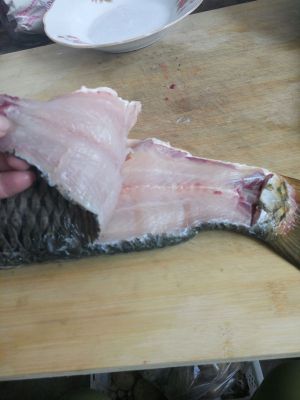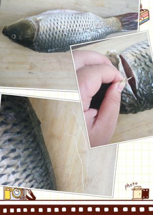 鲤鱼清洗干净,鱼头鱼尾划开取出鱼腥线,不能断哦!