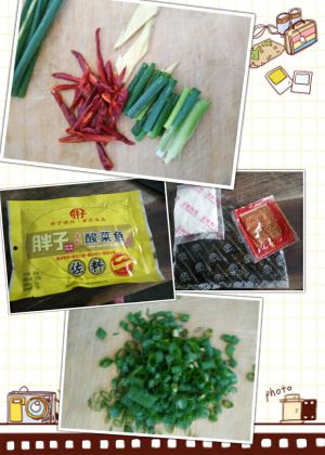 先切好配料,葱切段,切成葱花,姜切片,干红辣子脚斜刀切成段,成品酸菜鱼一包,我买的这包不行,要买带一包酸菜,一包淹鱼料,一包炒酸菜放的调料,挣个汤的味道就看它了,还有一包鱼做好后放的麻油,吃起来够味!