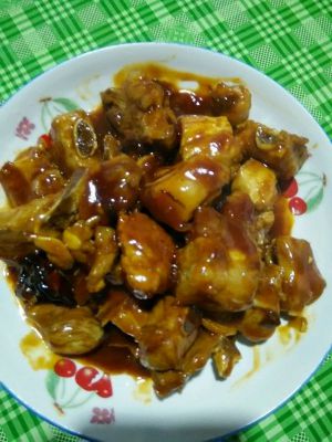 4.翻炒到猪肋骨变颜色,倒点开水,番茄酱,陈醋,有需要再加其他作料(鸡精之内的)开小火把汤汁烧干,汁干就可以起锅了。
