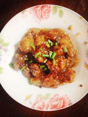裹面粉油炸,小火,第一遍起锅后,第二遍控油,炸至金黄,起锅。