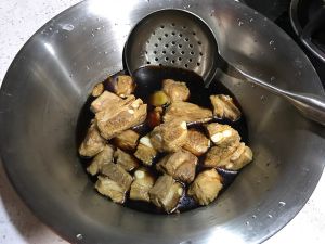 锅里下点油,酱先下,以融化糖,后再下排骨,中火,快速翻炒